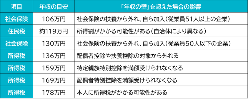 改正後の主な「年収の壁」と、それを超えた際の影響については下記のとおりです。
